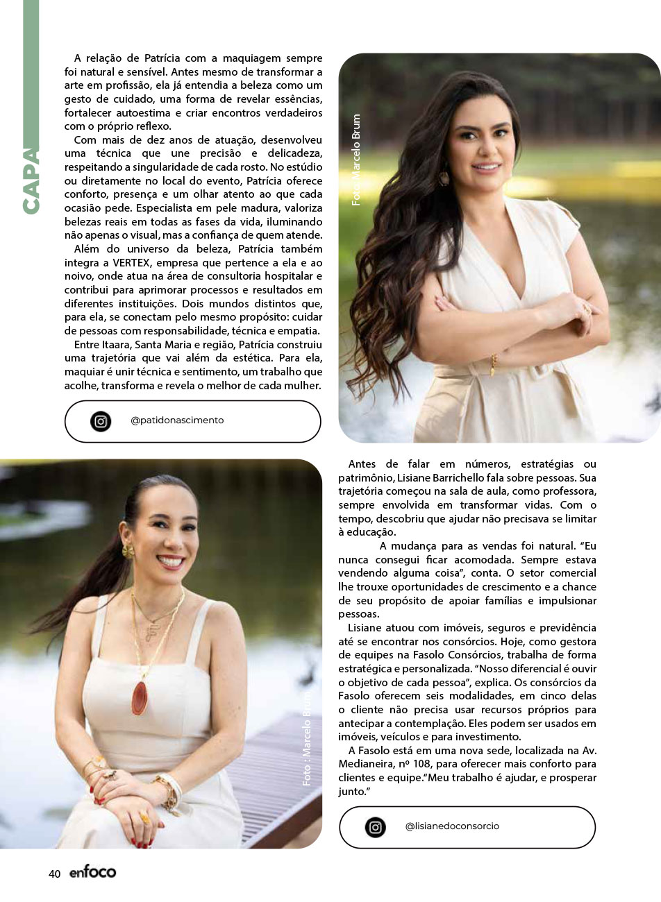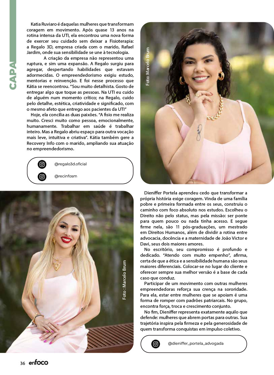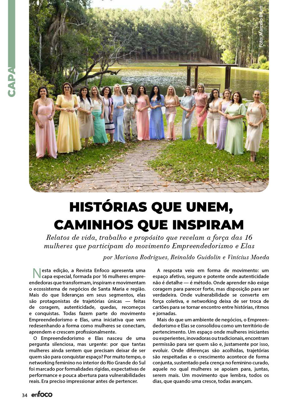A Capa da Revista Enfoco dos meses de Novembro e Dezembro de 2025 foi mais uma ação promovida e organizada pelo movimento Empreendedorismo e Elas, para a 7ª edição. Uma maneira de levar o propósito do movimento de juntas somos mais para nossa sociedade Santa-mariense.